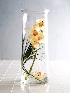 inside perimeter of vase, and gently place Cymbidium orchids or lilies into the vase.