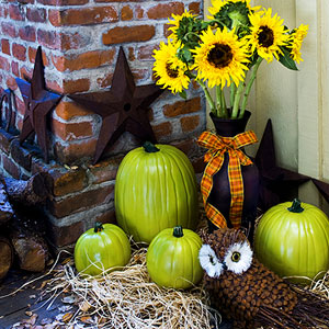 Take pumpkins and stack them into a topiary. Start large on the bottom and cap off with one thats a little smaller. Remove the tops of the bottom two to secure pumpkins placement. You can also take a steel rod or landscaping stake (both from a hardware store) to hold them more securely. For added fun take the painted pumpkins from above and stack into fun colored arrangements. Put onto an old pot and use for a festive tablescape, fireplace decoration or porch decor.