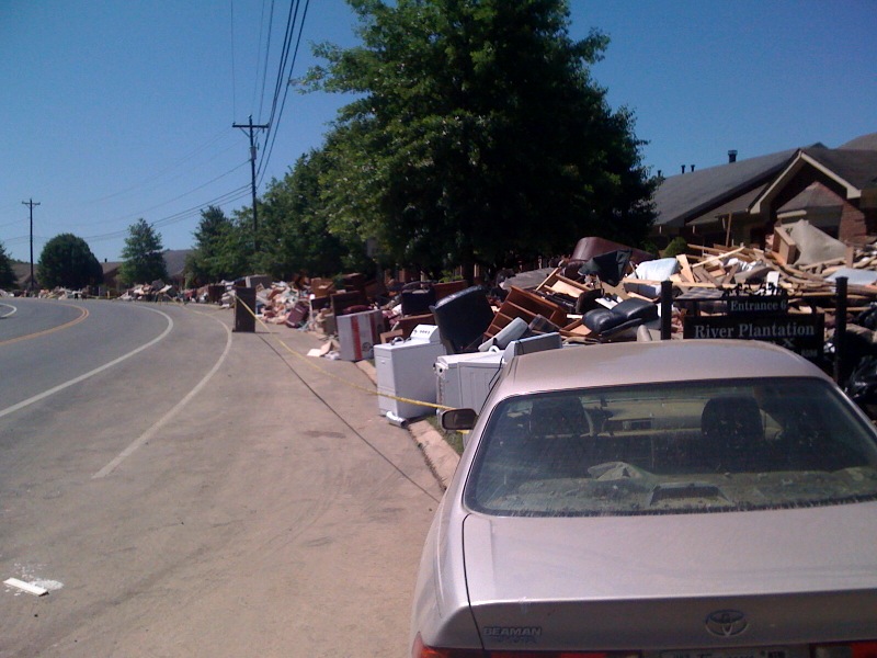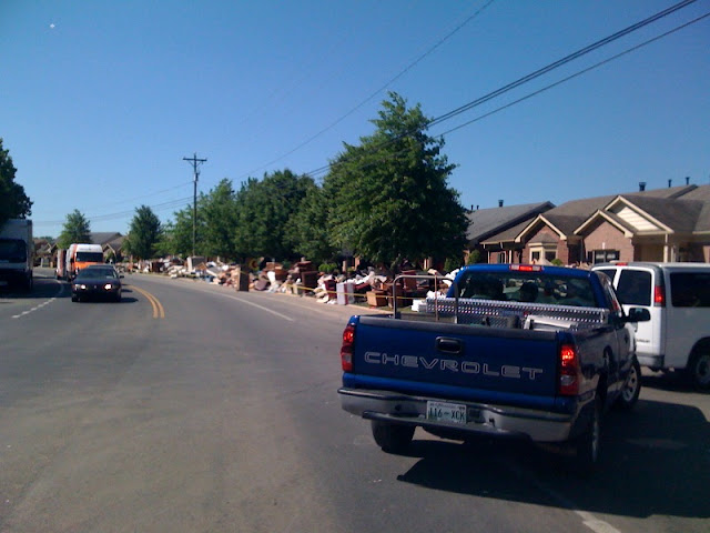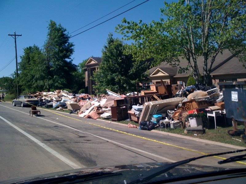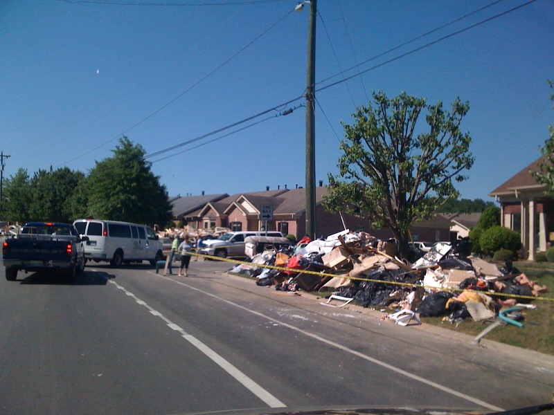 We arrived in River Plantation subdivision around nine thirty Saturday morning. This subdivision is located in Bellevue, TN and is one of the hardest hit areas from flood waters. The main entrance to the subdivision was barricaded off by metro police, ensuring that the traffic was not there to rubber neck. The devastation is incomprehensible. The streets are lined with worldly possessions, antiques, furniture, insulation, drywall, mattresses, appliances, clothes and piles of debris.