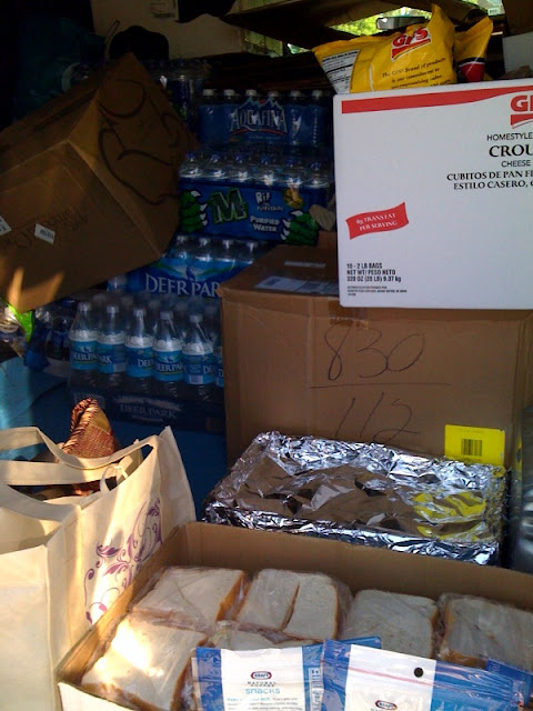 Our volunteering efforts for Saturday were a huge success. We loaded the van with hundreds of cases of water, sandwiches, cookies, toiletries, cleaning supplies and stuffed animals for the kiddos.