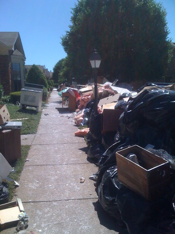 The sidewalks were littered with trash bags, insulation, appliances, mattresses, pictures, accessories, books, and furniture.