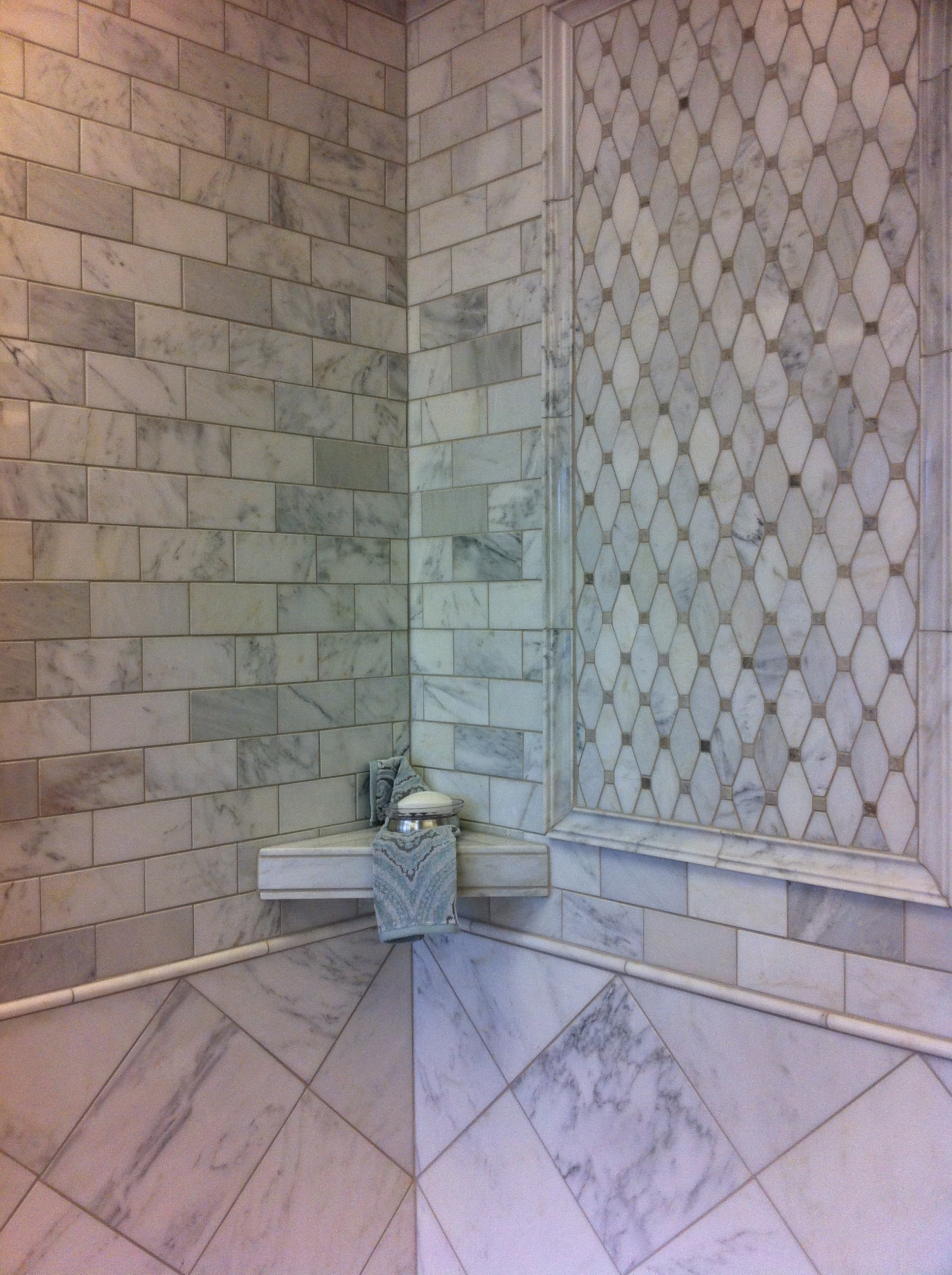 Traditionally considered a no no, mixing different tiles, sheen and colors is now very common , and aesthetically pleasing. In this bathroom I mixed a glass tile with a subway tile.